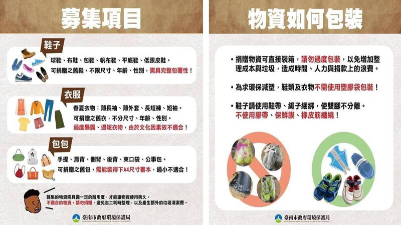 「舊鞋救命-台南募集活動」,號召市民整理家中堪用舊鞋、夏季衣物及A4尺寸以下包包,將愛心送往非洲偏鄉。(南市環保局提供)