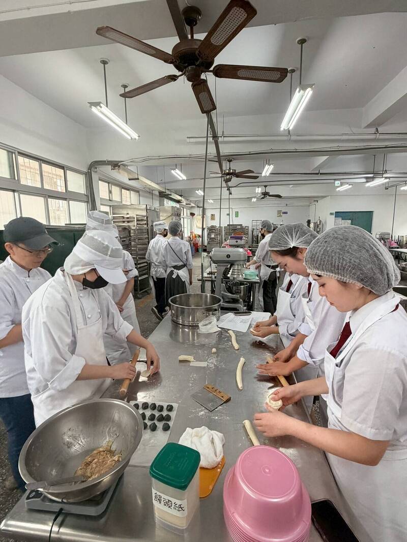 岡山農工食品科師生帶領日本岡工高校同學製作元宵、包子。(岡山農工提供)