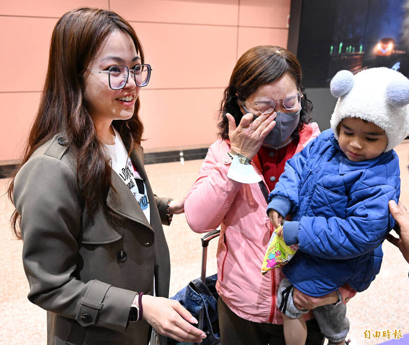 見到女兒平安回國,前往接機的母親激動落淚。(記者朱沛雄攝)