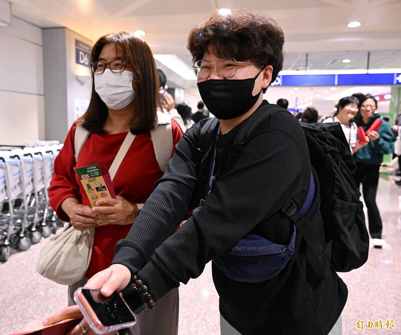 受中東戰火影響,阿拉伯聯合大公國等國家關閉領空,阿聯酋航空今(4)日恢復飛航桃園機場,第一架飛台的EK366航班下午飛抵台灣,旅客下飛機後面露開心表情。(記者朱沛雄攝)