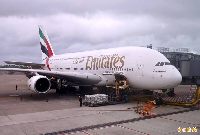 阿聯酋航空今(4)日恢復飛航桃園機場,第一架飛台的EK366航班下午飛抵台灣。(記者朱沛雄攝)