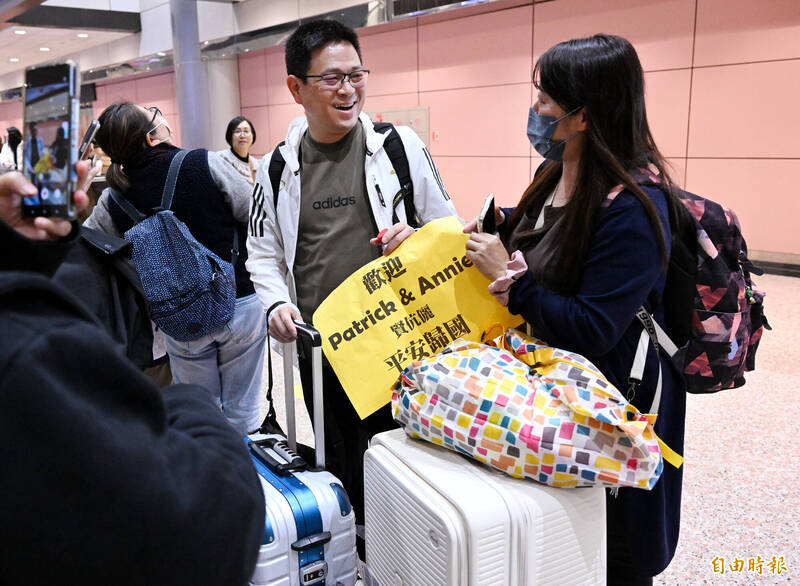 前往桃園機場接機的王小姐在入境大廳與平安歸來的先生相擁而泣。(記者朱沛雄攝)