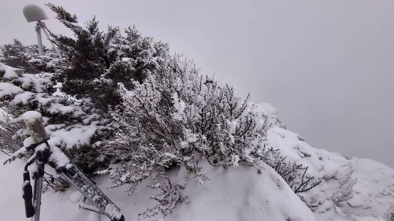 惟昨晚再度降雪,今天凌晨雪勢較大,清晨降雪停止,玉山氣象站一帶地面雪深達5公分,氣象站屋頂與戶外測量儀器均可見覆蓋一層白雪,植株也出現美麗的霧淞,宛如北國世界。