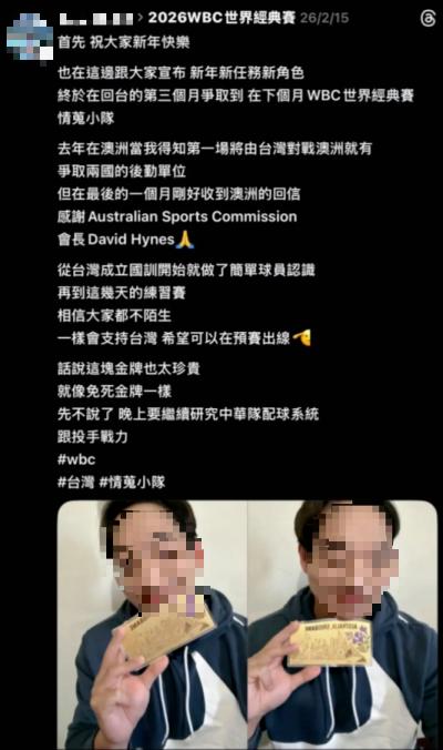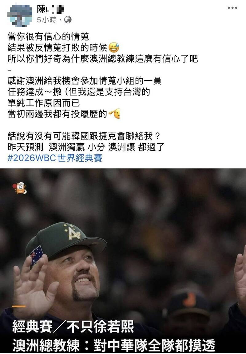 2026世界棒球經典賽(WBC)昨日登場,台灣隊首戰以0:3不敵澳洲,後續卻有人在網路發文自稱是澳洲隊情蒐小組成員,貼文內容暗酸台灣隊「當你很有信心的情蒐,結果被反情蒐大敗的時候」,引發網友留言灌爆,原PO雖刪文關閉帳號,但有網友起底他的社群發文發現,他自稱曾擔任WBC培訓人員及中華隊體能訓練師,質疑其職業倫理,且在諷刺台灣隊的貼文還涉及賭博言論,也讓網友批評「情蒐+簽賭+在公部門任職」、「相關情蒐人員,是可以買運彩的嗎」。