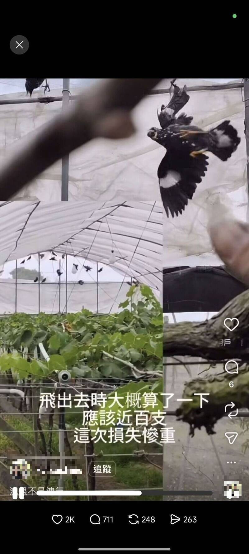 徐男也說,八哥常整串葡萄只啄破一顆,果汁流出後整串很快腐爛,一群鳥一天就可能造成數萬元損失,他花了3個多小時把網室內的鳥放走,還得花1、2天清理受損葡萄。
