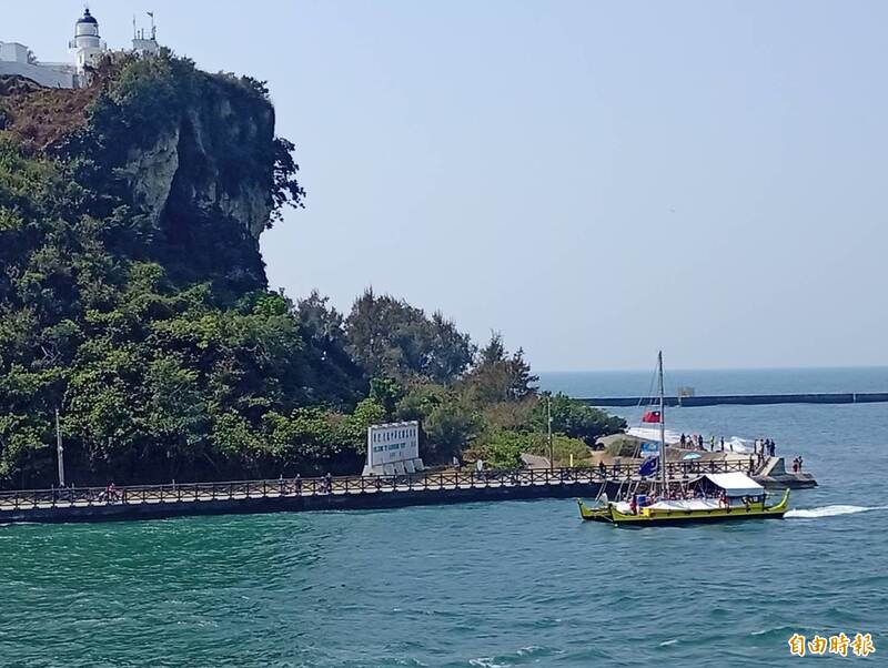 無私分享號(右)航進高雄港,與旗后山(左)及高雄燈塔(左上)相互輝映。(記者洪定宏攝)