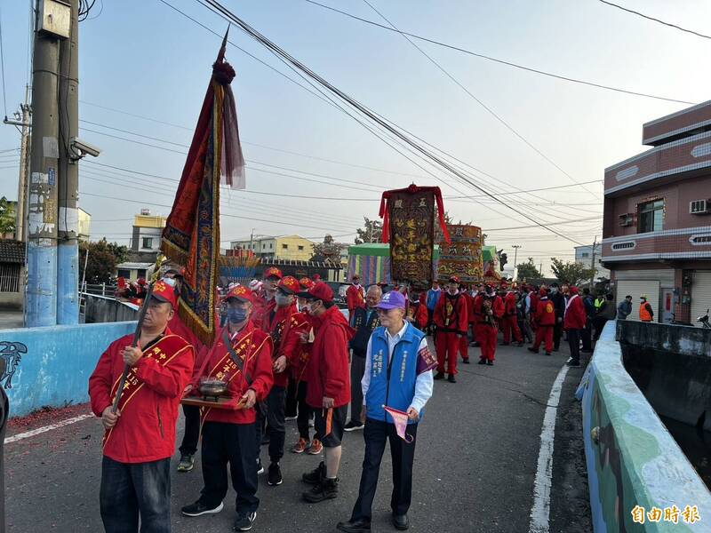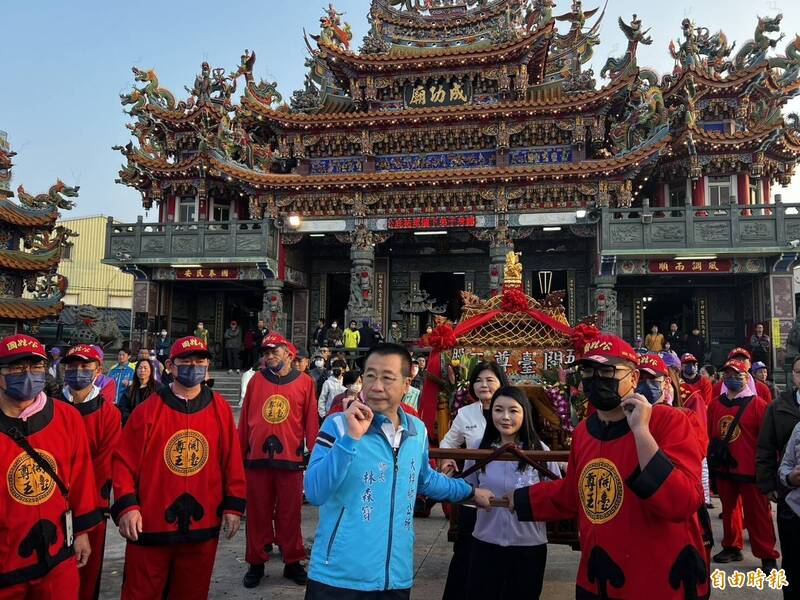 雲林縣定民俗「五股開臺尊王過爐」大典8日登場,縣長張麗善、立委張嘉郡、大埤鄉長林森寳等人扶轎起駕。(記者黃淑莉攝)
