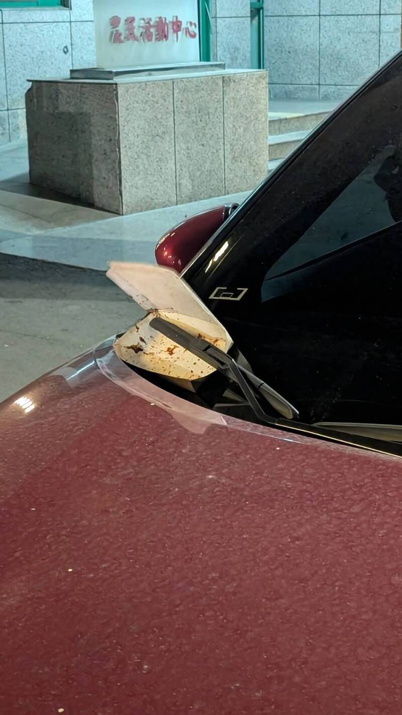 彰化和美近來出現「垃圾怪客」,把油油的餐盒隨機夾在車子前擋雨刷處。(擷取自和美小鎮)