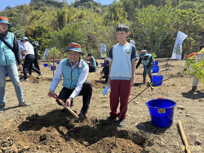 林業及自然保育署台中分署分署長張弘毅和小朋友一起植樹。(記者歐素美攝)