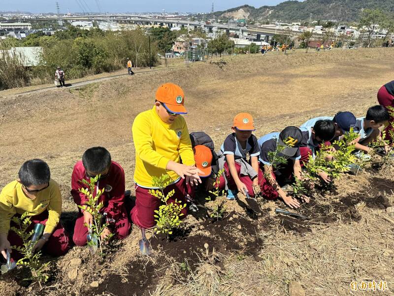 翁子國小學童努力種樹。(記者歐素美攝)