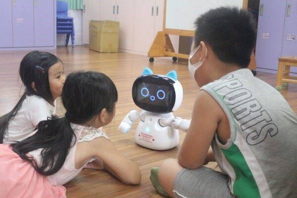 新竹縣學童與凱比機器人互動。(新竹縣政府提供)