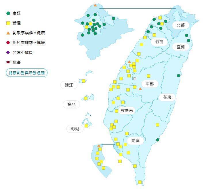 空氣品質部分,宜蘭、花東空品區為「良好」等級;北部、竹苗空品區及馬祖、澎湖為「普通」等級;中部、雲嘉南、高屏空品區及金門為「橘色提醒」等級。