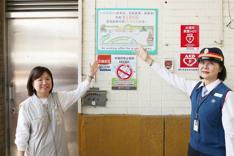 嘉義市衛生局長廖育瑋(左)與台鐵嘉義車站代表展示禁菸示。(嘉義市政府提供)