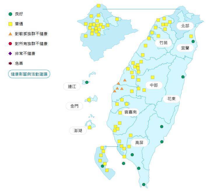 空氣品質部分,宜蘭、花東空品區為「良好」等級;北部、竹苗、中部、雲嘉南空品區及馬祖、金門、澎湖為「普通」等級,雲嘉南空品區短時間可能達橘色提醒等級;高屏空品區為「橘色提醒」等級。