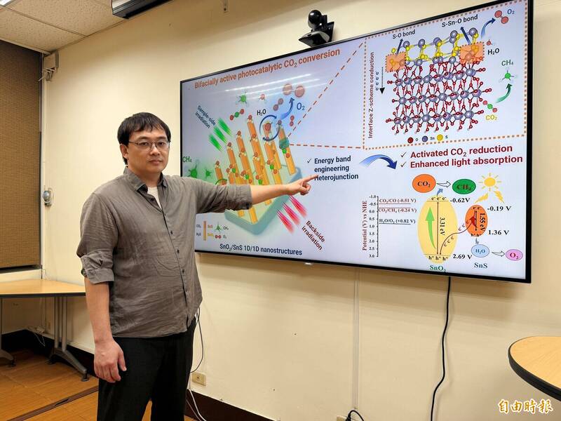 李炫錫研究團隊成功模擬植物光合作用原理,研發出新型奈米光觸媒材料,能利用太陽光將二氧化碳轉換為甲烷(CH4)等燃料。(記者許麗娟攝)