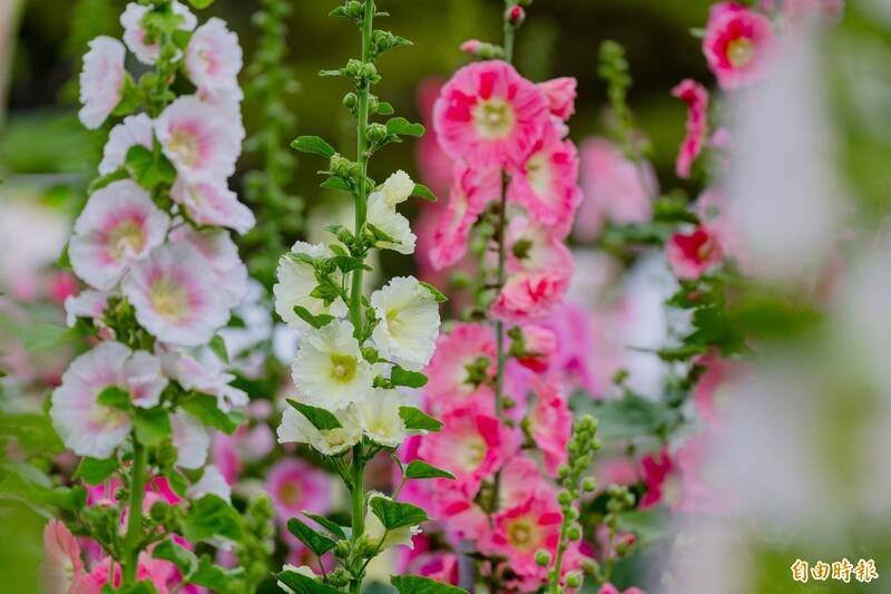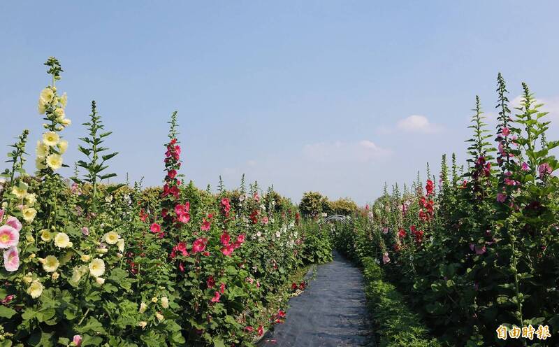 蜀葵花最高可達2公尺以上,漫步其中彷彿置身於色彩斑斕的迷宮。(記者陳冠備攝)