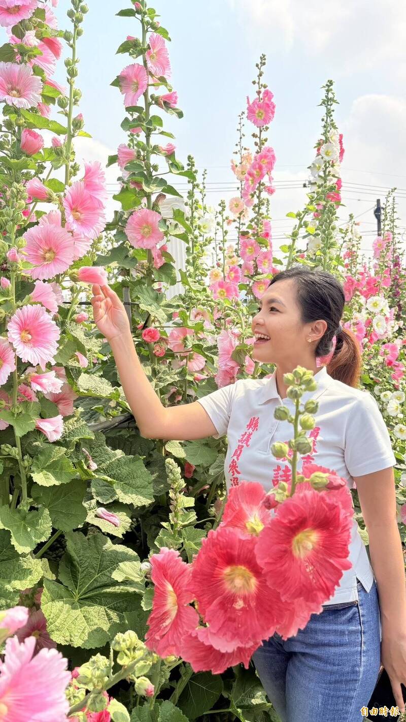 蜀葵花最高可達2公尺以上,民眾賞花拍照格外新奇。(記者陳冠備攝)