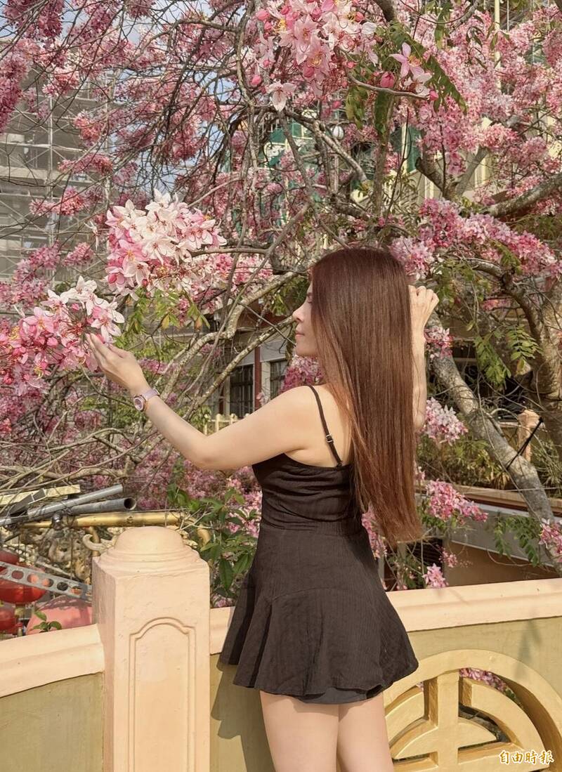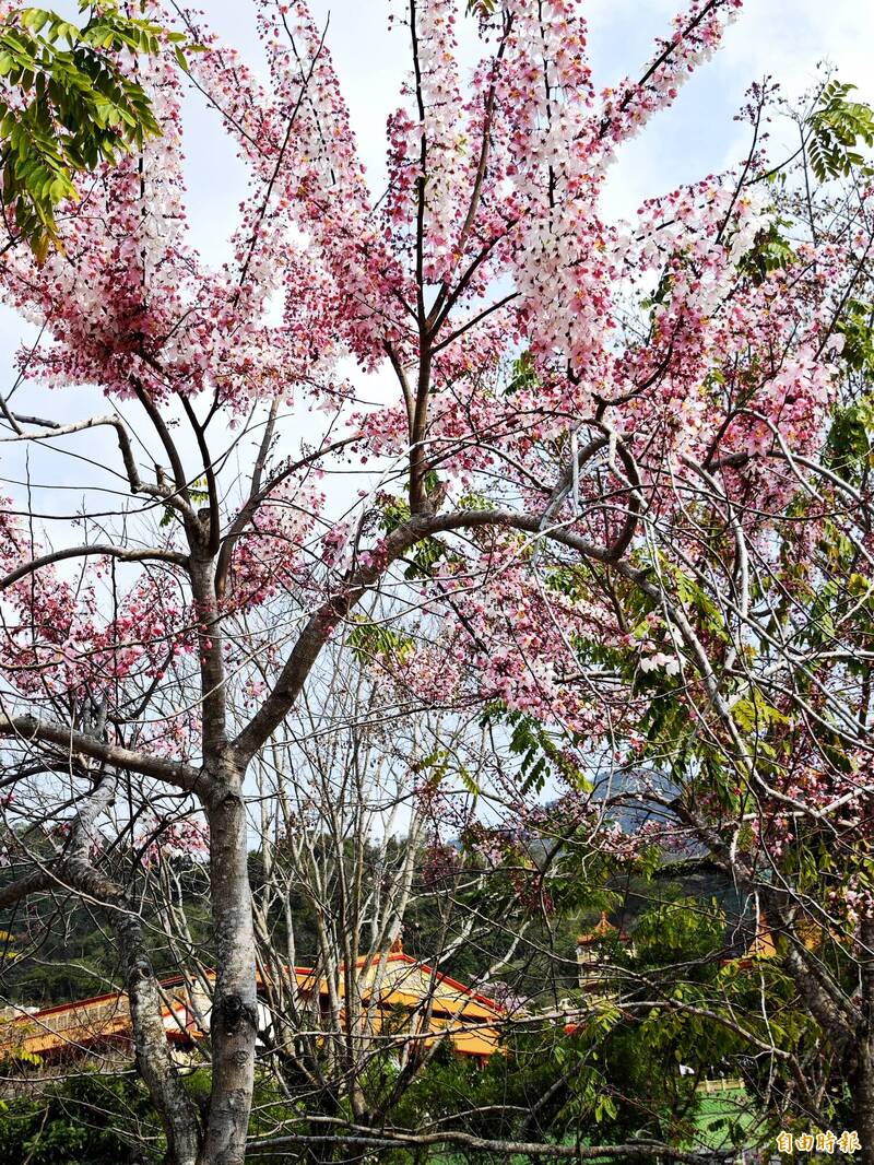 寶光聖堂的花旗木陸續綻放,大佛手旁的「泰國櫻王」盛開中。(記者吳俊鋒攝)