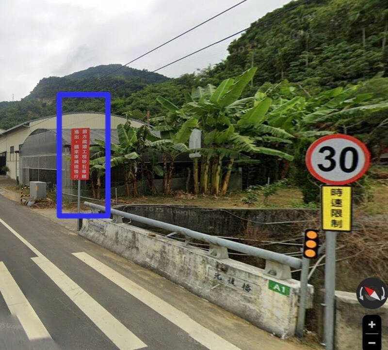 台14線雙冬光復橋段的速限30公里指示牌後,有疏濬工程施工的告示牌。(圖擷自Google地圖)
