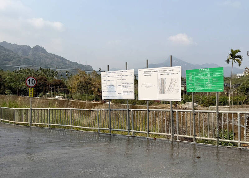 南投工務段到現場查看,發現是南投縣府的疏濬工程,相關告示牌在工區道路上。(公路局南投工務段提供)