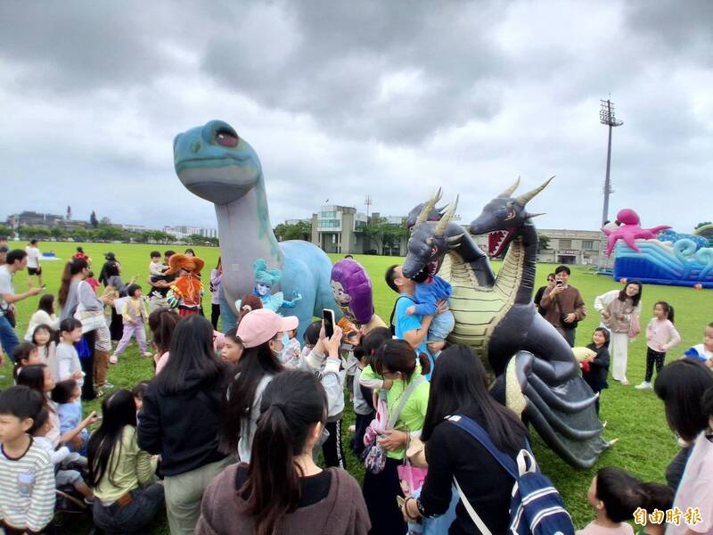 「宜蘭童樂會」在宜蘭運動公園登場,現場除有巨型氣墊童趣樂園、市集外,還安排大型腕龍玩偶及恐龍探險隊穿梭園區。(記者王峻祺攝)