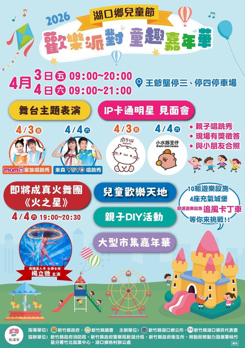 新竹縣湖口鄉兒童節「歡樂派對 童趣嘉年華」,4月3、 4日一連兩天將在王爺壟停3、停4停車場盛大登場!(湖口鄉公所提供)