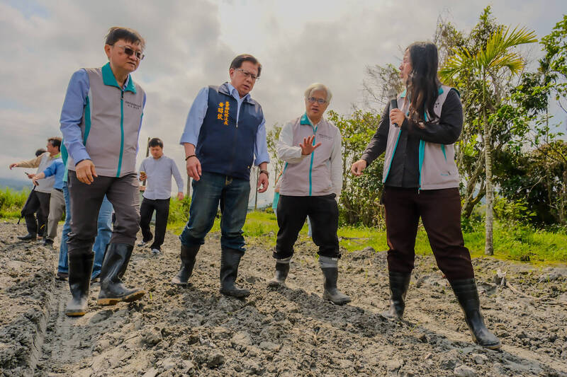 農業部政務次長黃昭欽(右1)率隊赴花蓮縣光復鄉,實地視察多處受災農業場域,瞭解農地復耕及農村產業振興辦理情形。(農業部提供)
