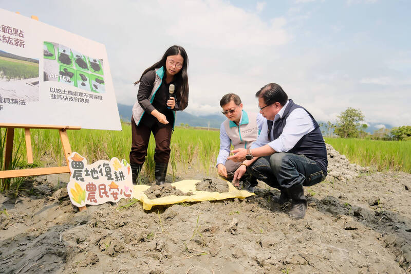 馬太鞍溪堰塞湖災後6個月,因大量淤泥損壞農地,農業部加速災後復耕,成功改善土壤,讓農機具順利進場,恢復生產。(農業部提供)