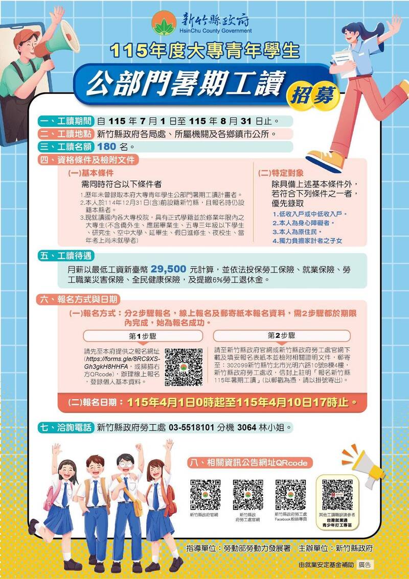 勞工處表示,今年暑期工讀的名額分布在縣府相關局處、所屬機關及縣內各鄉鎮公所的56個單位中,工讀期間自7月1日至8月31日。申請資格為2025年12月31日(含)前設籍於新竹縣,現就讀國內各大專校院、過去未曾錄取縣府暑期工讀的在學生,為照顧弱勢族群,身心障礙者、低收入戶、中低收入戶、原住民及獨力負擔家計者之子女將優先錄取。