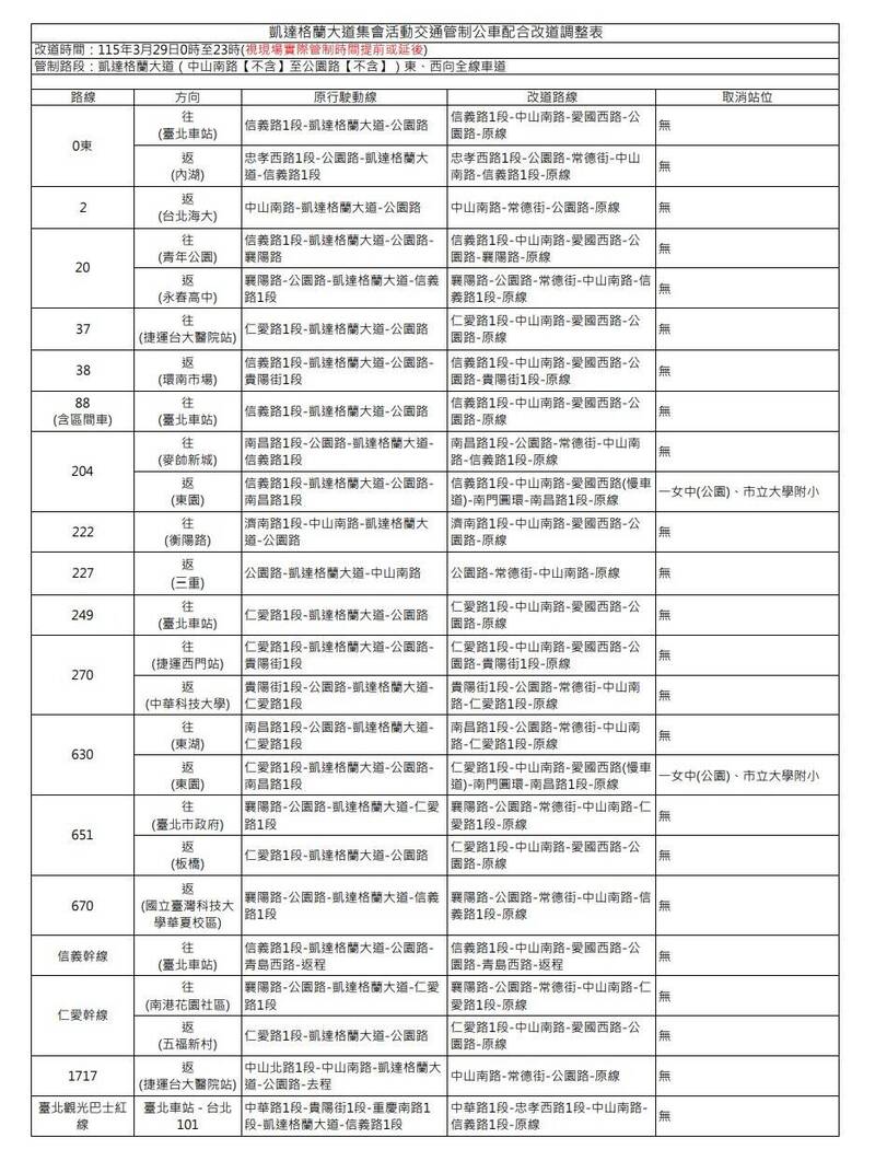 因應凱達格蘭大道(中山南路至公園路間)東西向全線車道交管,原行駛該路段需改道的路線公車,包括0東、2、20、37、38、88(含區)、204、222、227、249、270、630、651、670、信義幹線、仁愛幹線、1717、台北觀光巴士紅線。
