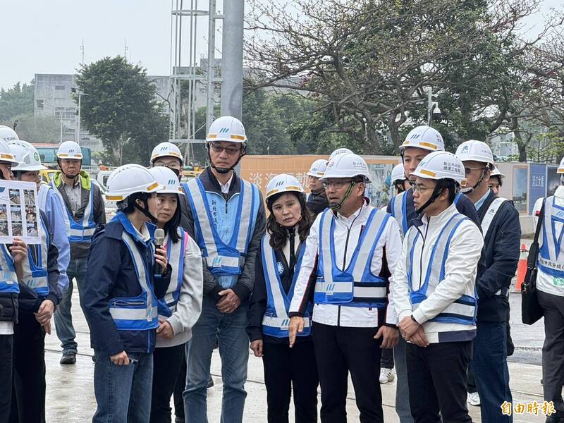 新北市長侯友宜(右2)、立委洪孟楷(右1),以及市議員鄭宇恩(左2)、陳家琪(左3)、陳偉杰(右後)等人赴捷運淡海線第2期先期工程視察。(記者羅國嘉攝)