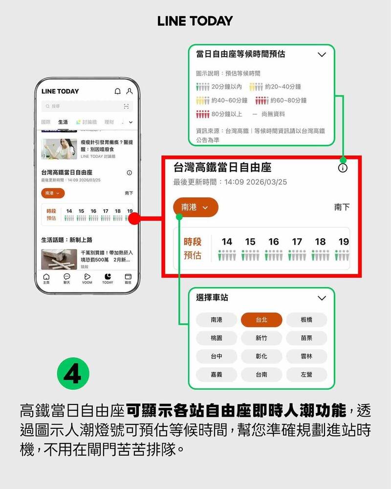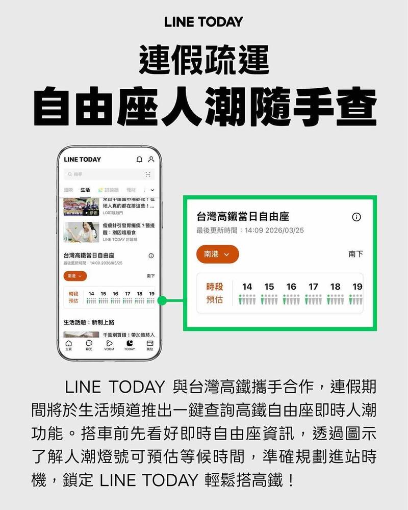 台灣高鐵與LINE TODAY「生活頻道」合作,疏運期間推出「當日自由座等候時間預估」。(圖由高鐵公司提供)