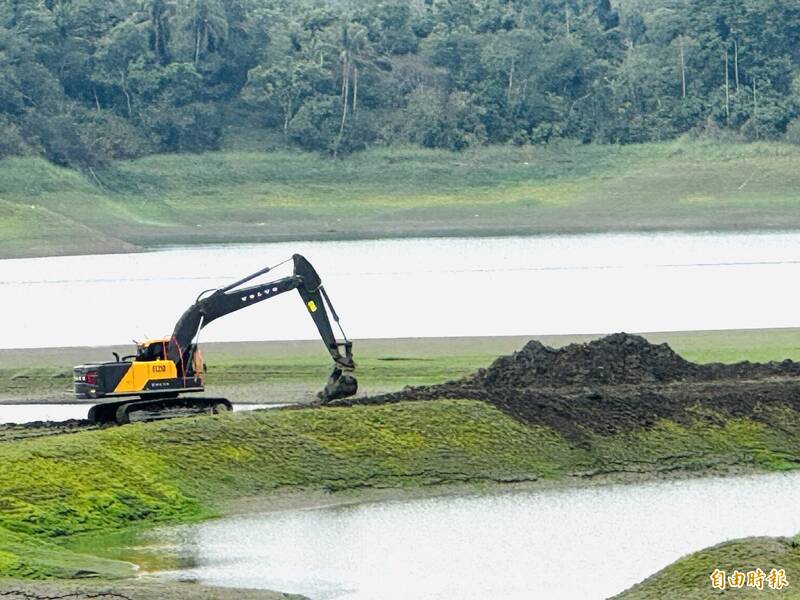 仁義潭水庫已有挖土機進場清淤。(記者蔡宗勳攝)