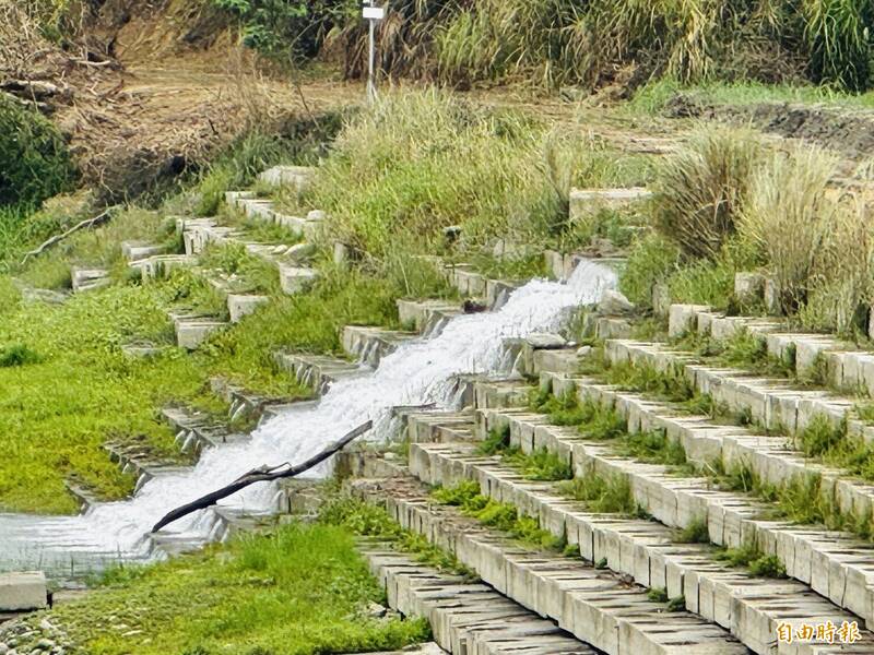 仁義潭水庫出現青青草原的景象。(記者蔡宗勳攝)