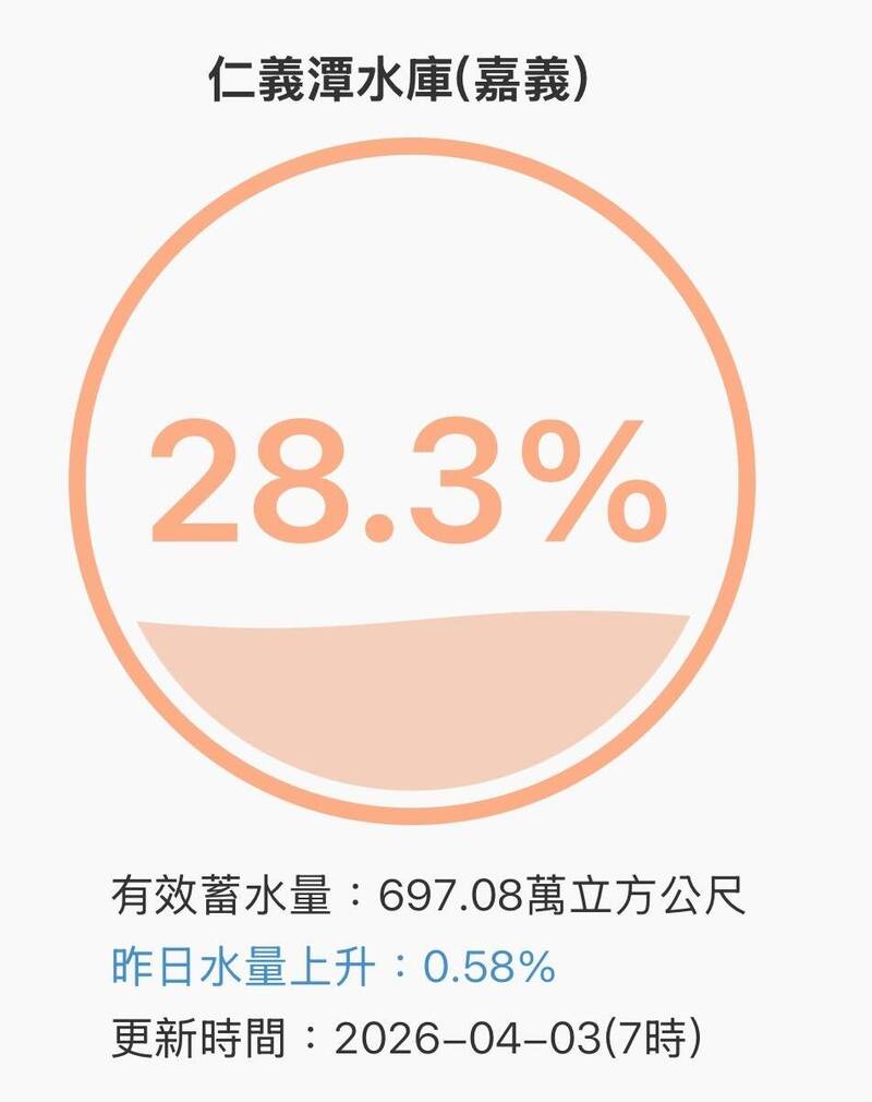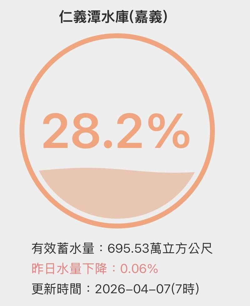 這波鋒面雖為嘉義地區帶來較大的降雨,但供應嘉縣市民生工業用水的仁義潭與蘭潭水庫,蓄水量幾乎沒有什麼變動,今天上午的合計蓄水量比4月3日還少了15萬噸,如果以4天出水量加上蒸發量約40萬噸推算,這波春雨只有進帳25萬噸,對水情助益並不大。