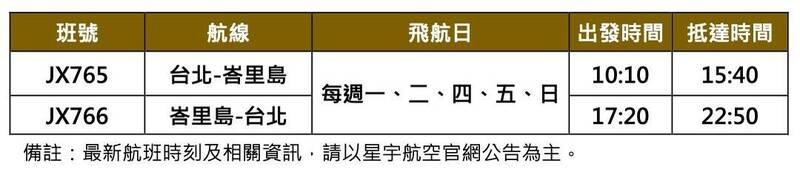星宇航空台北-峇里島航線航班時刻表。(星宇航空提供)