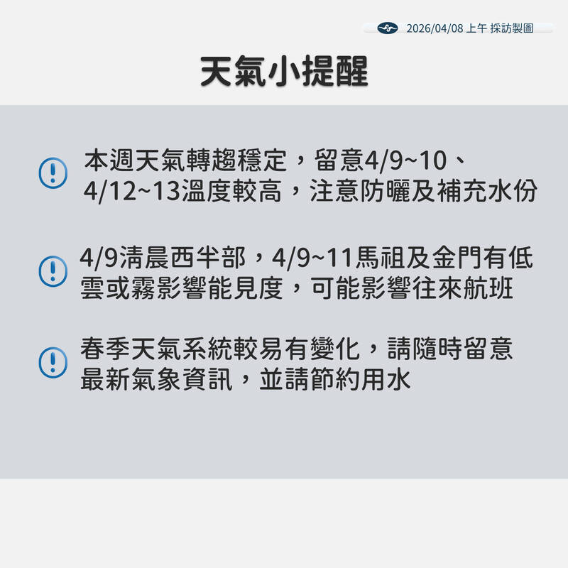 天氣小提醒。(氣象署提供)