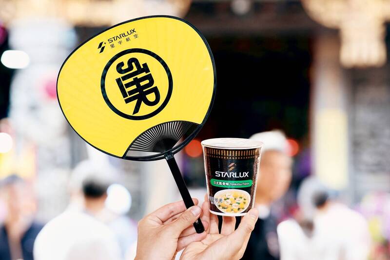 星宇航空特別準備經典「勇」字款扇子及與日清食品聯名的杯麵作為結緣品。(星宇航空提供)
