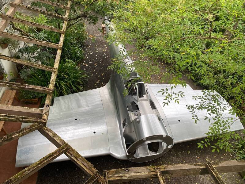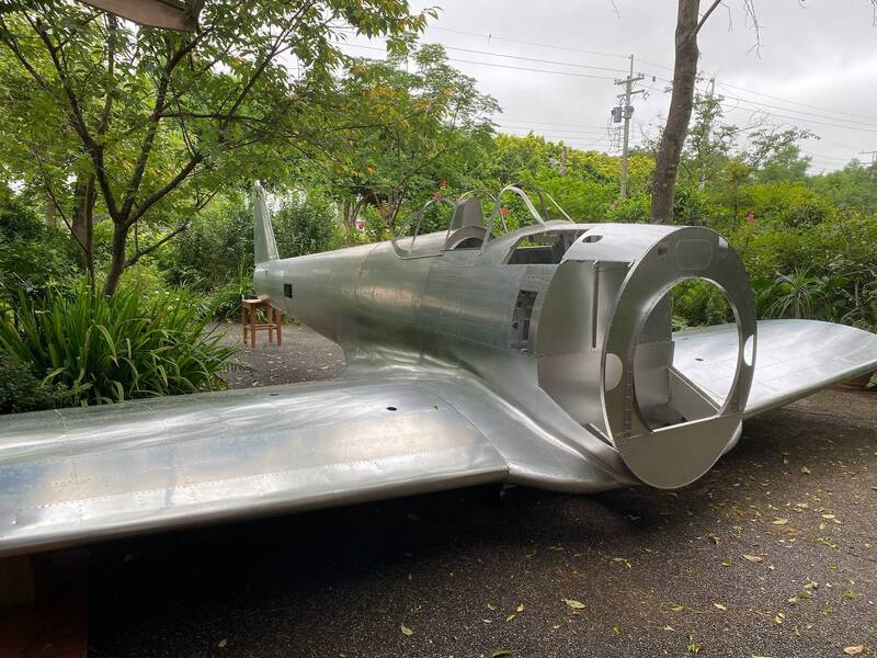這架按1:1比例、純手工打造的日本二戰「一式戰鬥機」(Hayabusa,隼)放在民宿庭院相當壯觀。(陳士鉅提供)