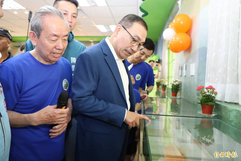 「三代同堂」的校友為侯友宜在校史室導覽解說坪頂百年歷史的文件足跡。(記者羅國嘉攝)