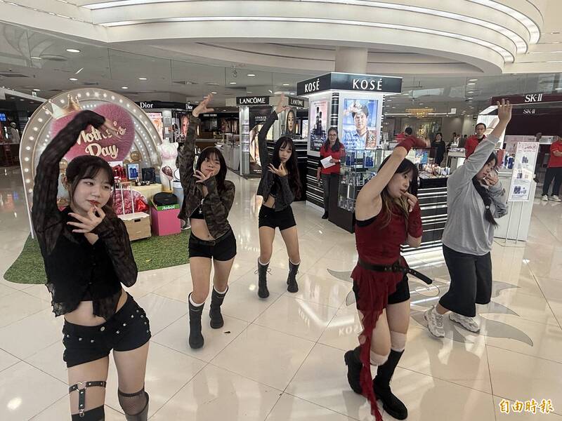 台南市光華高中的流行MV舞蹈社五位辣妹帶來勁歌熱舞,炒熱台南大遠百母親節檔期造勢活動。(記者王俊忠攝)