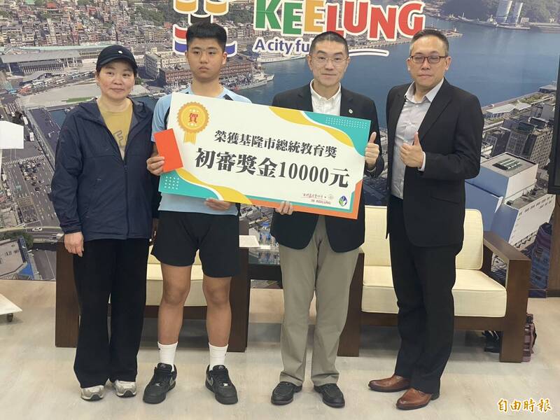 基隆市立正濱國中學生陳宇峰(左二)入圍總統教育獎,基隆市長謝國樑(圖右二)頒發獎金1萬元。(記者俞肇福攝)