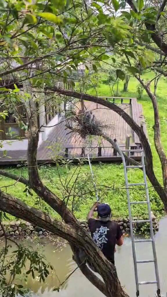 宜縣吳沙國中有黑冠麻鷺築巢,園藝工人為修剪樹木,竟侵爬上去侵擾雛鳥,試圖讓牠們棄巢而去。(網友提供)