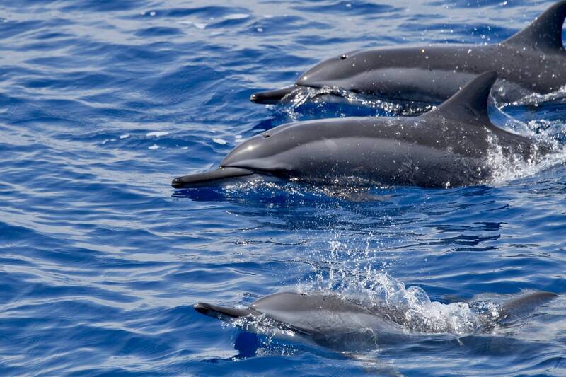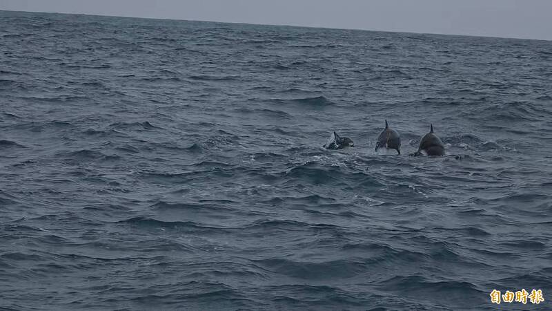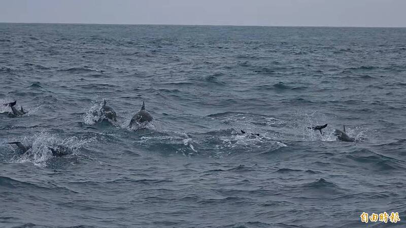 成群飛旋海豚在海上跳躍圍繞船隻。(記者花孟璟攝)