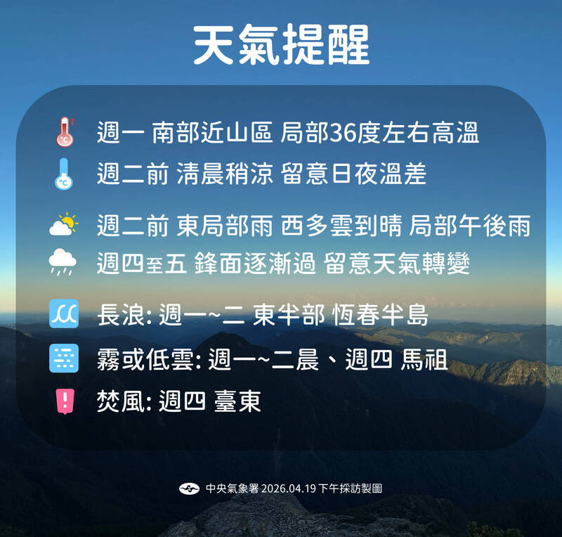 天氣提醒。(圖為中央氣象署提供)