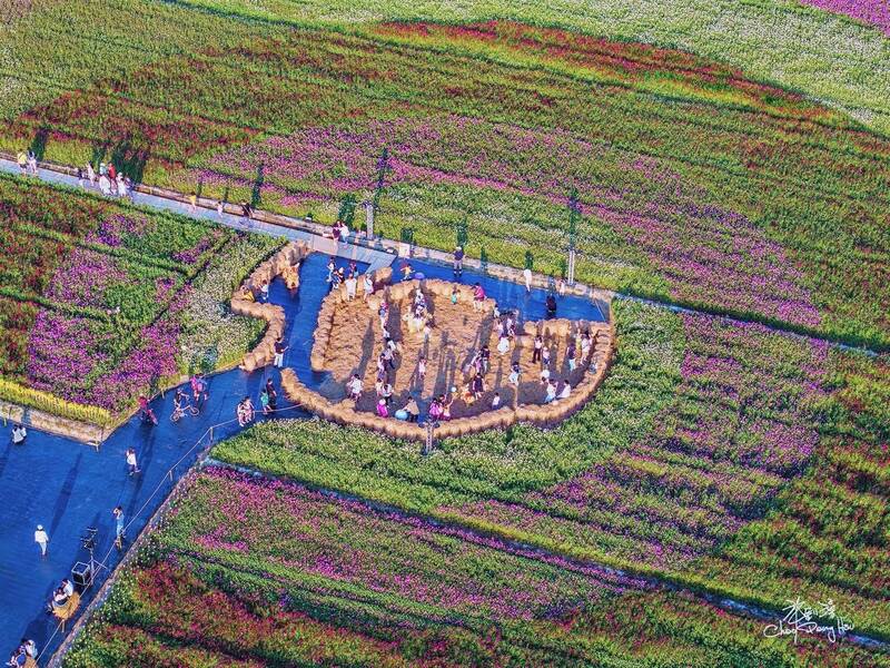 竹北「陌上花開」波斯菊同心圓花海。(圖由攝影家許釗滂提供)
