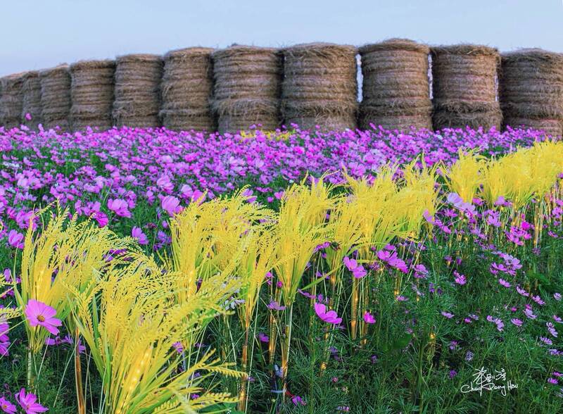 竹北「陌上花開」波斯菊花海搭配燈飾和牧草牆柱,一整個超好拍。(圖由攝影家許釗滂提供)