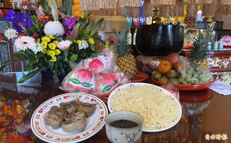 「旱溪媽祖遶境十八庄」今天抵達「富陽軒八卦祖師廟」駐駕一晚,廟方準備豬腳麵線為媽媽進補,象徵添壽延福。(記者陳建志攝)