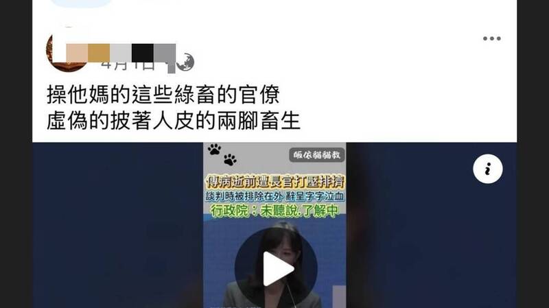 根據檢舉人提供的截圖顯示,王男臉書充斥批評政府言論,在「鄭習會後首發聲」的新聞貼文中,王男留言指控「綠畜黨以和平包裝舔美賣台,直接把台灣帶入滅頂之災」。此外,他多次PO文針對政治議題發表看法,頻繁使用「綠畜」、「兩腳畜生」、「癩皮狗」等侮辱性字眼,另外在教育部的言論自由日發文中,轉貼發文稱「我不認同教育部,甚至引以為恥」相關言論引發關注。