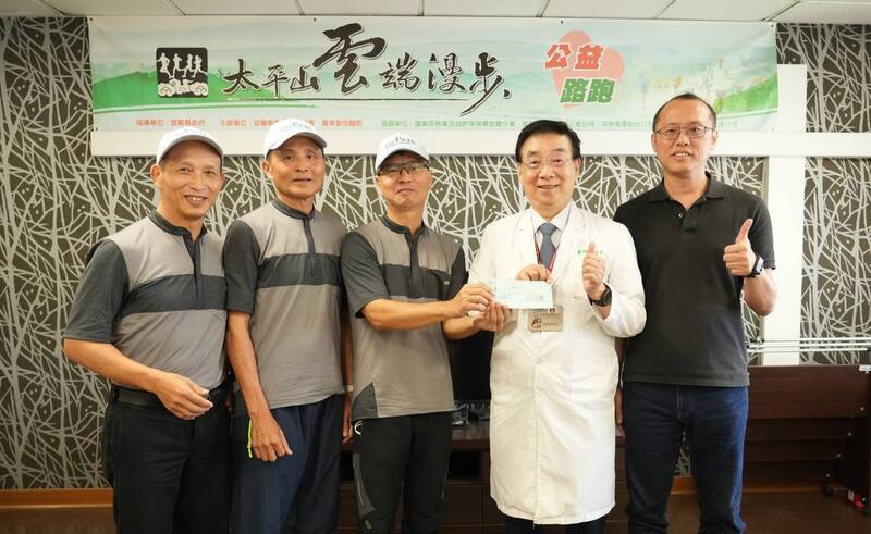 宜縣鐵人三項協會捐贈8萬元報名費給澎湖惠民醫院,由羅東聖母醫院院長馬漢光(右2)代為受贈。(圖由羅東聖母醫院提供)